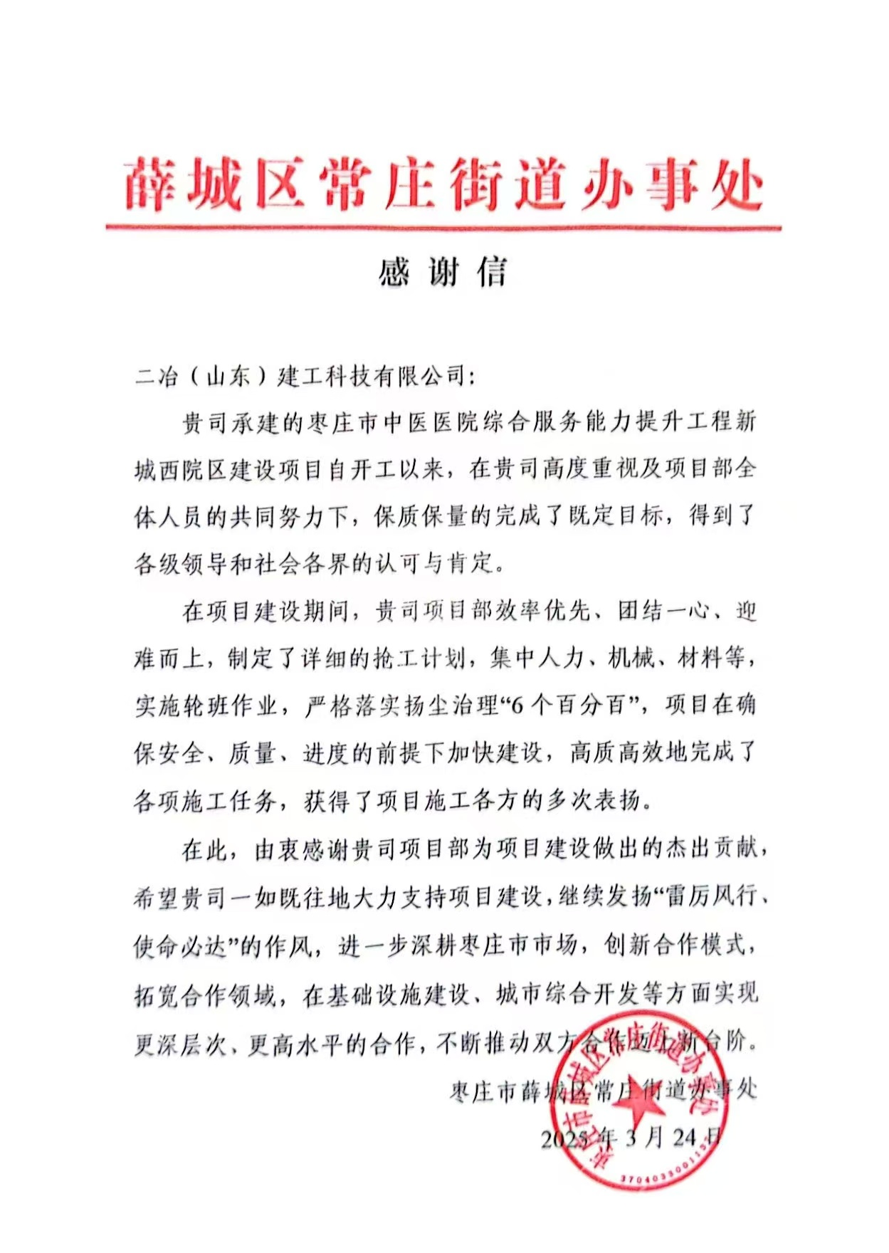 3月24日,中國二冶全資子公司二冶(山東)建工收到棗莊市薛城區(qū)常莊街道辦事處的感謝信。信中對(duì)棗莊中醫(yī)醫(yī)院項(xiàng)目自開工以來的卓越表現(xiàn)給予了極高的贊譽(yù)。